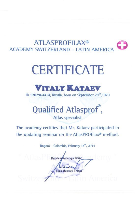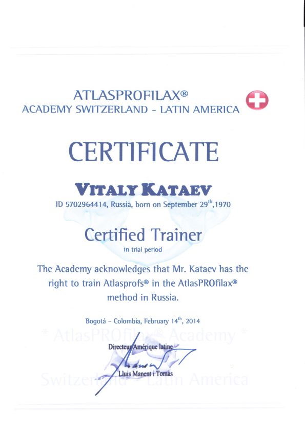Сертификация на базе международной Ассоциации AtlasPROfilax®. Контроль качества осуществляется инструктором Академии AtlasPROfilax®.