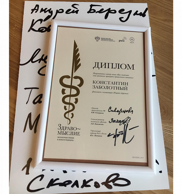 Константина Заболотного наградили дипломом финалиста литературной премии в области медицины «Здравомыслие». Жюри отметило его книгу «Как химичит наш организм: принципы правильного питания» в номинации «Рецепт здоровья», в которой соревнуются популярные издания о здоровом образе жизни.